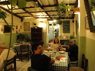 We spent the day in Puerto Vallarta again because my bug was caught by Joe and we had to get that fixed before we got too far down the road. Last night our hosts took us down by the tourist area where we saw some Indians in traditional dress, went to Miguel's artist studio, then to a little area where he used to teach art. The cans you see in the pictures were done by another artist that shares the studio - I found his sense of humor to be very funny. The refrigerator magnet is from the place that our hosts order chicken from. The Italian restuarant where we went to dinner was really good and very reasonable - great calamari. They make their own pasta and it was delicious.